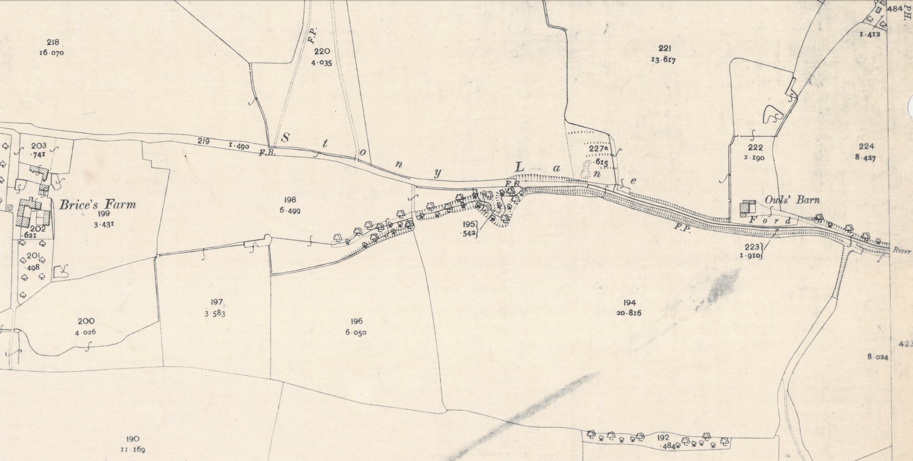 In this map the Groaning Stone sits just about where the triangular shape in the trees appears on Stony Lane and likely where the numbers 195.542 are marked.